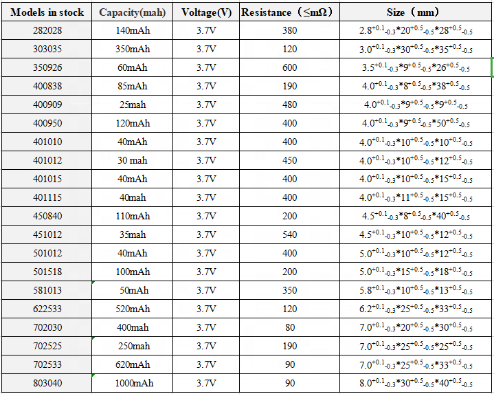Produktnavn | 581013 3,7V 50mAh polymer litiumbatteri | Bemerke | |